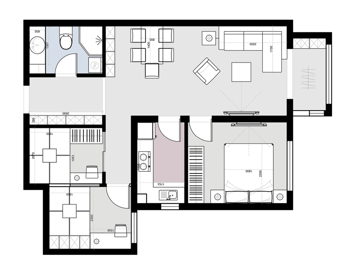 該案原始戶型是一個(gè)兩居室 ,對(duì)于空間的需求首先滿足的是客戶三代人五號(hào)之家的居住需求。孩子男孩現(xiàn)在上小區(qū),父母偶爾會(huì)來住,但臥室必須要獨(dú)立。在居住習(xí)慣上女主人喜歡干凈簡潔的灰色系,通過溝通最終確定做現(xiàn)代輕奢。為了滿足需求在原有兩居室的基礎(chǔ)上規(guī)劃了三居室。衛(wèi)生間也同時(shí)改為干濕三式分離。為了突出空間特性,在整體色調(diào)上保持黑白灰的主調(diào),加入暖色燈來調(diào)節(jié)空間氛圍。在高冷的空間中有不失柔和的一面。