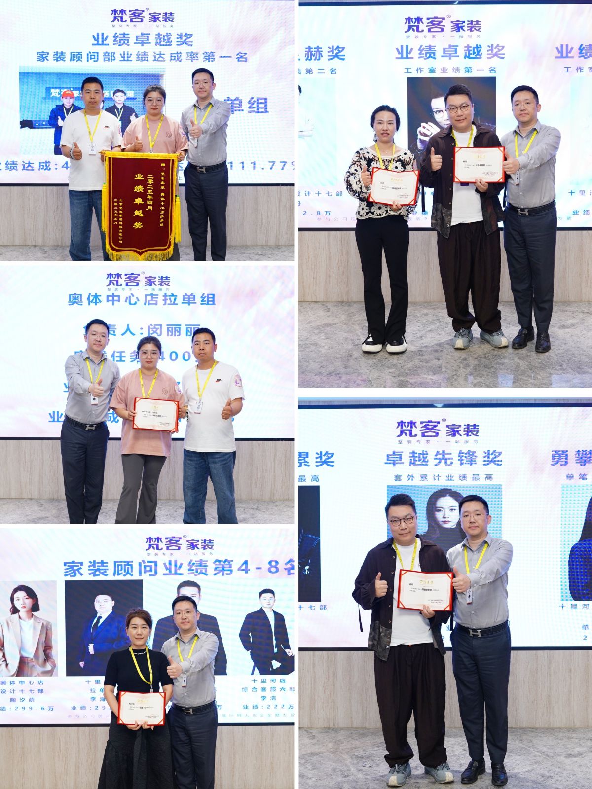 隨后,對4月取得優秀業績的員工進行表彰,包括設計部團隊獎/個人獎及家裝顧問部團隊獎/個人獎等。他們是才華橫溢、為業主帶來省心體驗的資深設計師,是熱情細致、做好多方對接服務工作的家裝顧問,用不懈的努力為公司榮譽奉獻了自己的力量。