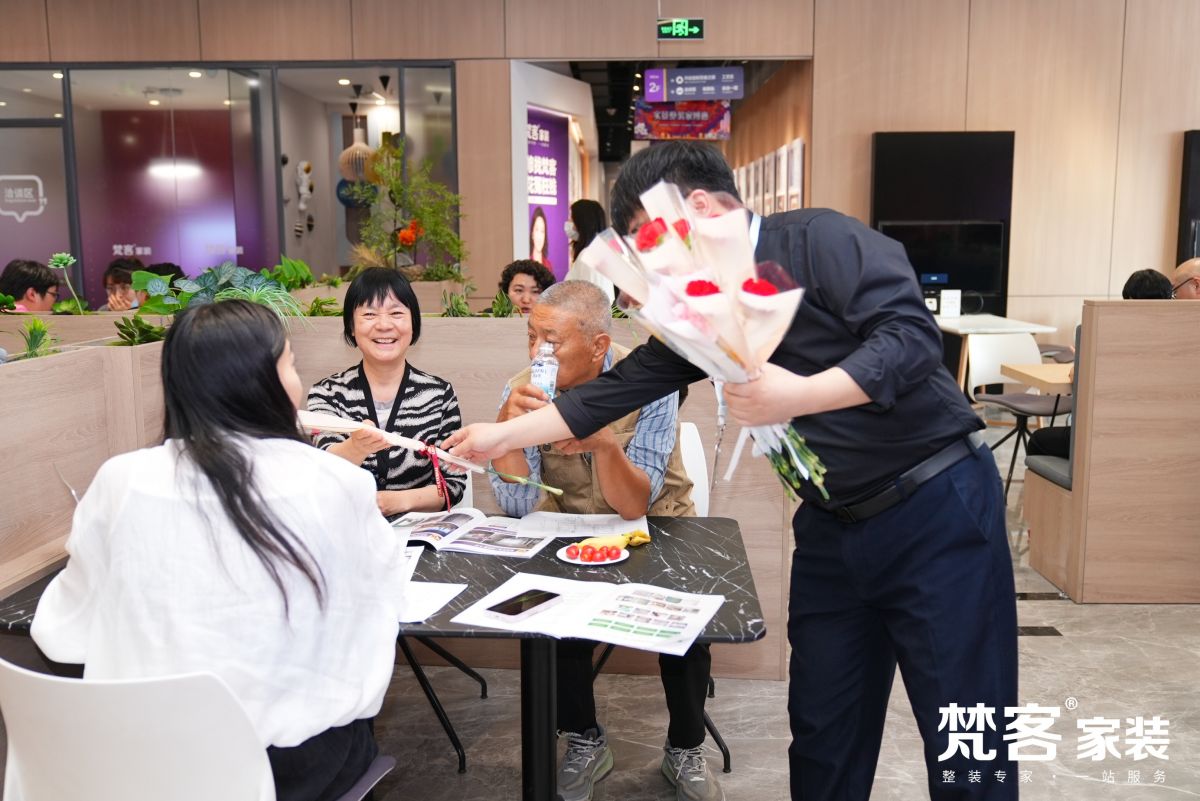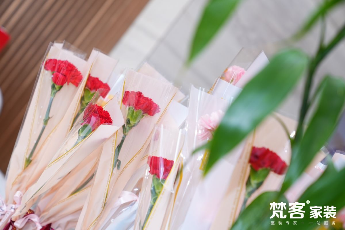 母親節(jié)的來臨,為梵客實景整裝家博惠增添了一份溫情色彩,鮮花擺滿大廳,甜品無限量供應,誘人的奶香味由二樓蔓延到一樓,處處都是欣喜。
