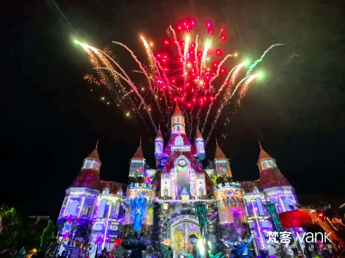 直至夜色完全降臨,觀賞項(xiàng)目又為大家放出一顆巨型彩蛋,音樂噴泉、煙花秀隆重上演,城堡因閃爍的光芒而變得富麗堂皇、空中盛開的煙花點(diǎn)亮了整個(gè)夜空…大家舉目仰望,共同祈愿此刻的繁花似錦定格成永恒的星光璀璨。