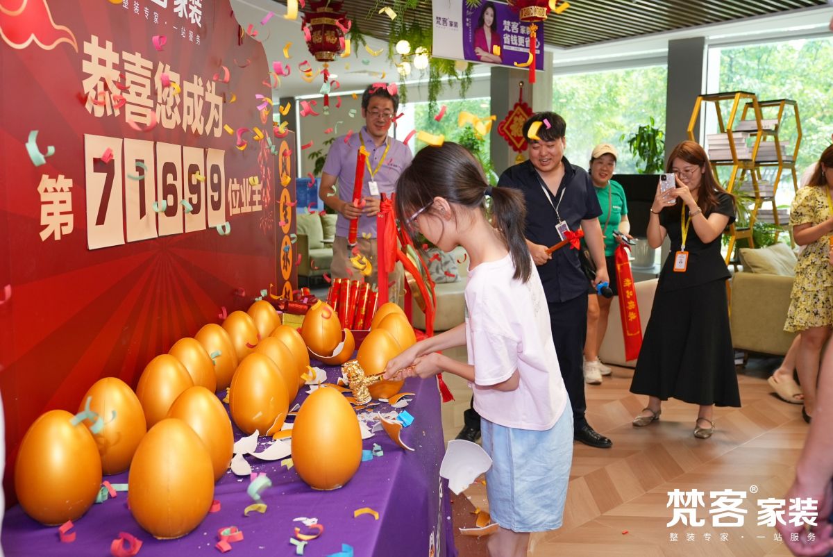 梵客家裝擁有多種格調的洽談間、開放廳、雅座,溝通方案舒適愜意,激發裝修靈感。已經簽約的業主朋友還可享受砸金蛋贏大獎的機會,其中包括大牌家電、免單大獎、折扣優惠等,多了一份驚喜。
