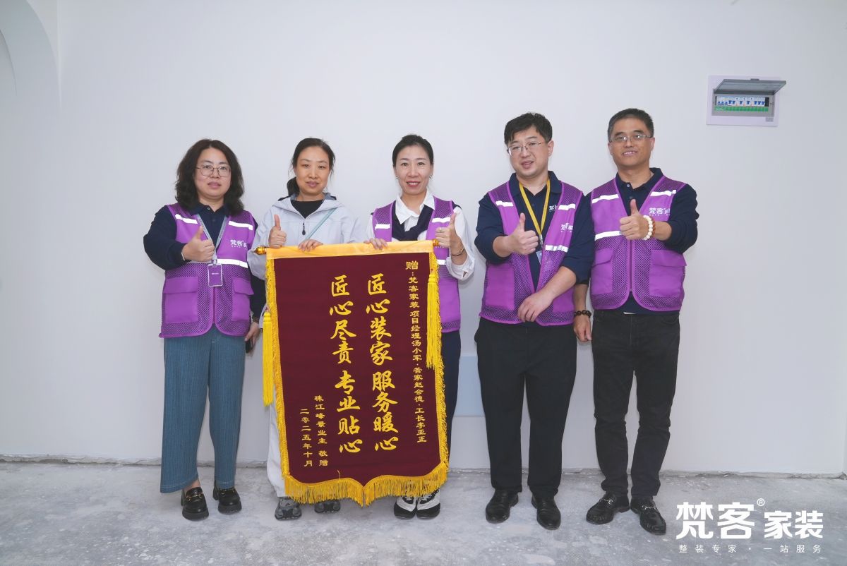 第二家工地依然處于施工階段,業(yè)主同樣也帶來錦旗。“匠心盡責(zé)”是對(duì)梵客最大的褒獎(jiǎng)。梵客家裝成立18年,已為數(shù)萬名業(yè)主提供了滿意的裝修服務(wù),每次接到錦旗,看到業(yè)主滿意的笑容、聽到發(fā)自內(nèi)心的贊譽(yù)之詞,都會(huì)深感責(zé)任重大,更堅(jiān)定了要夯實(shí)服務(wù)、做好產(chǎn)品的信念。