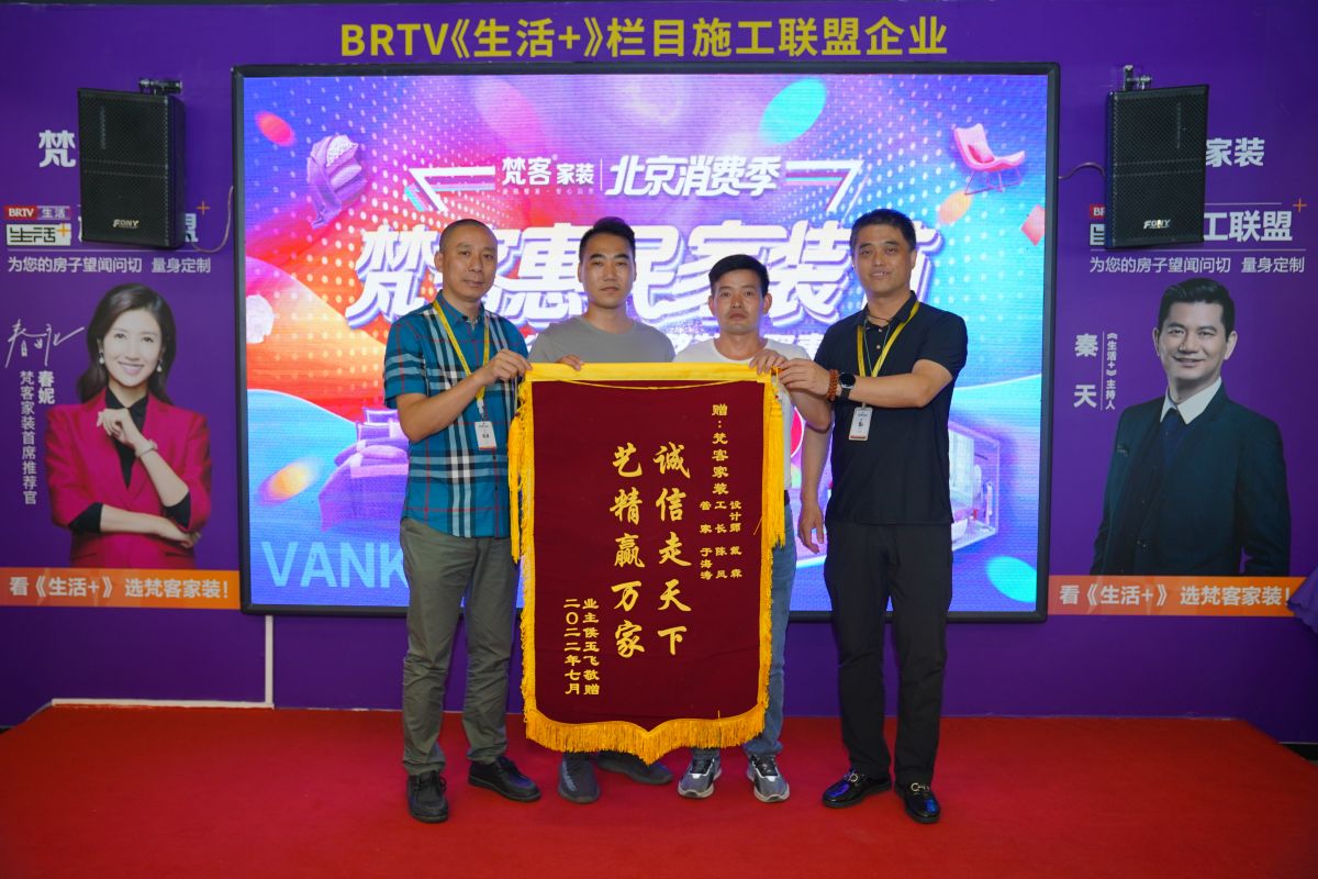 活動當天,已經裝修好的業主冒著高溫來到現場送來錦旗,表示:“對梵客家裝的服務特別滿意,裝修結果要比預想的好很多,最滿意的是梵客的專業、省心、周到!”