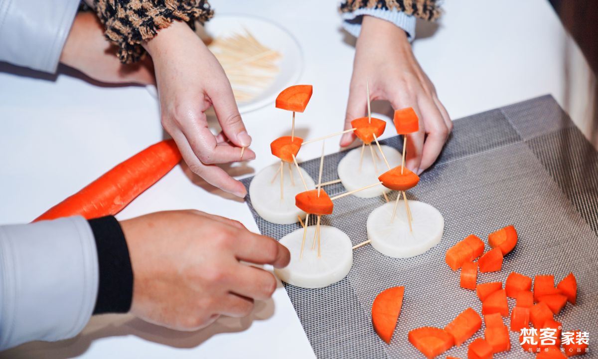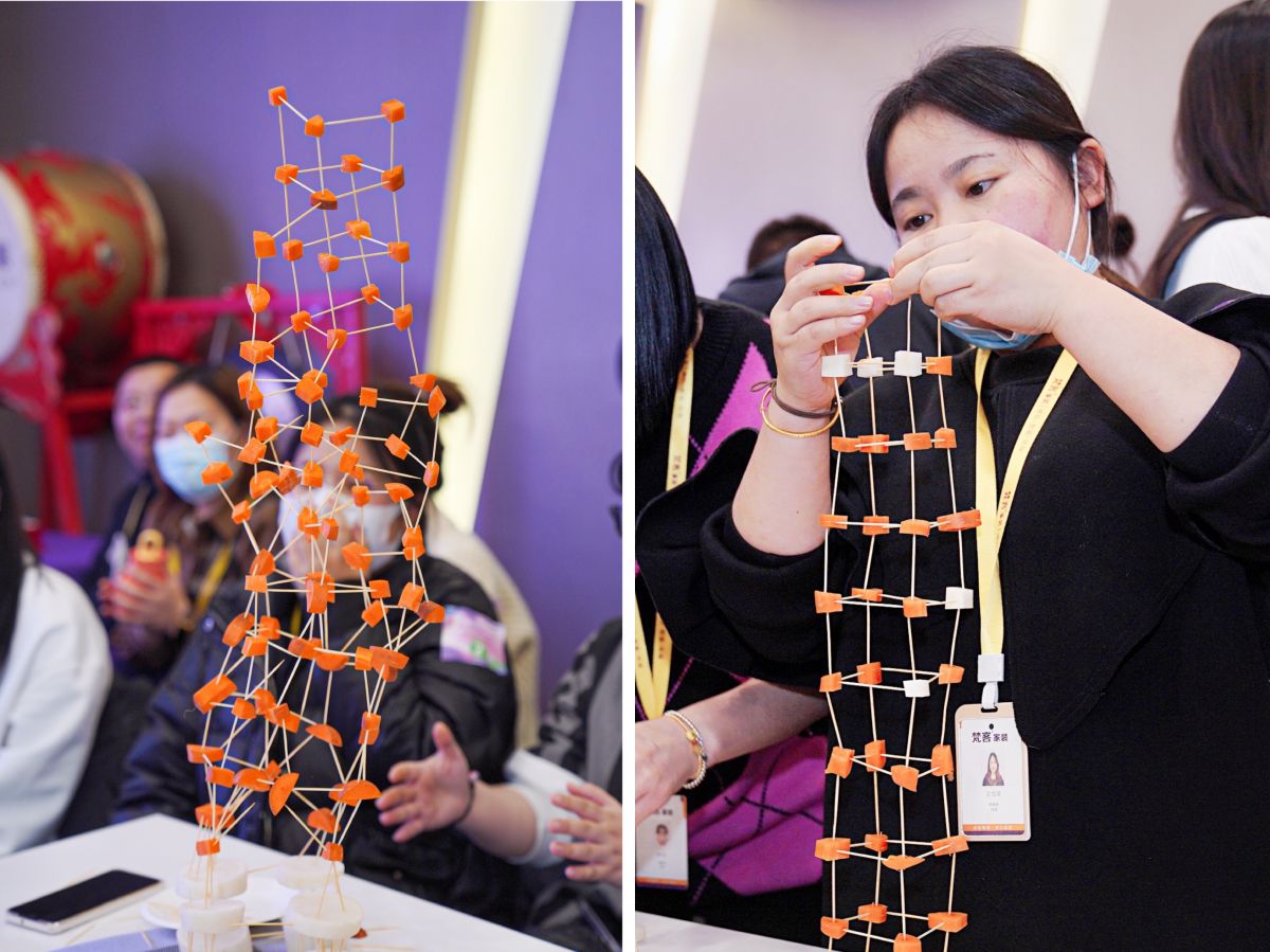 蘿卜塔,主要考核的是組員之間的相互配合精神,大家根據桌子上的工具,將蘿卜切塊、搭建,在規定時間內搭建越高、穩定性越強、支撐越久,就代表勝利。