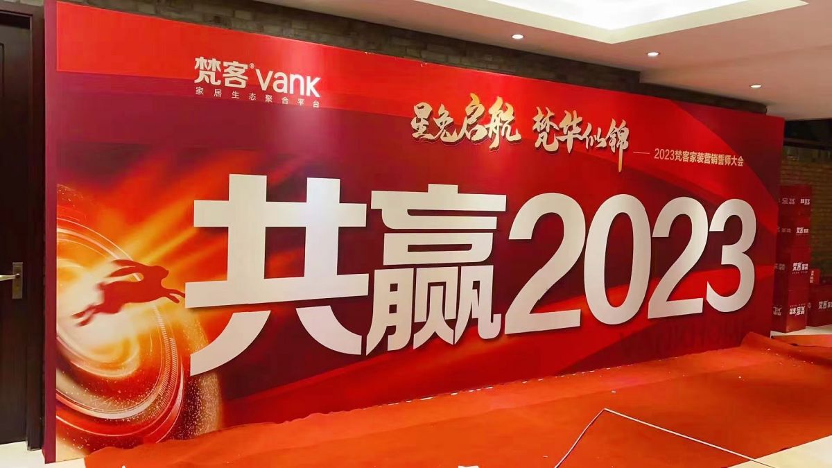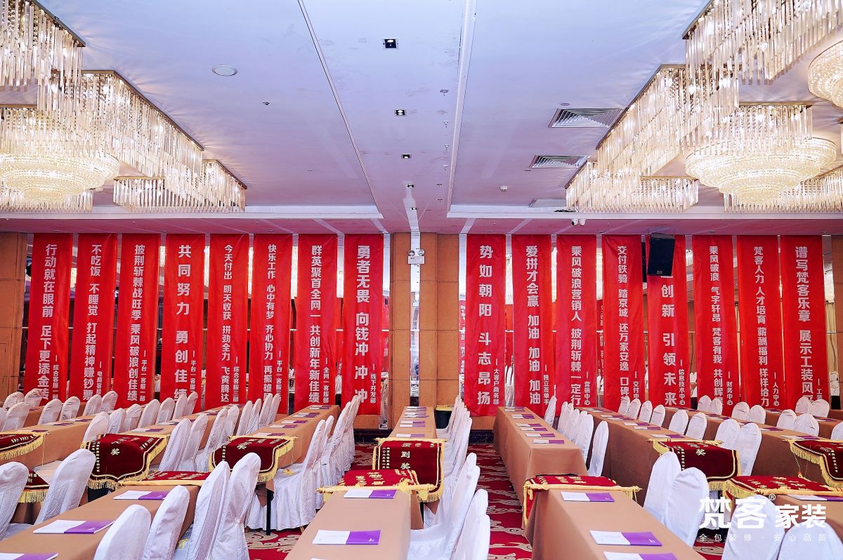 這是梵客家裝2023年首場大型會議,宴會廳現場,被熱情洋溢的中國紅點亮,營造出激勵人心的氛圍。以標語裝點的背景墻,更是抒寫了每位梵客勇士的心聲: