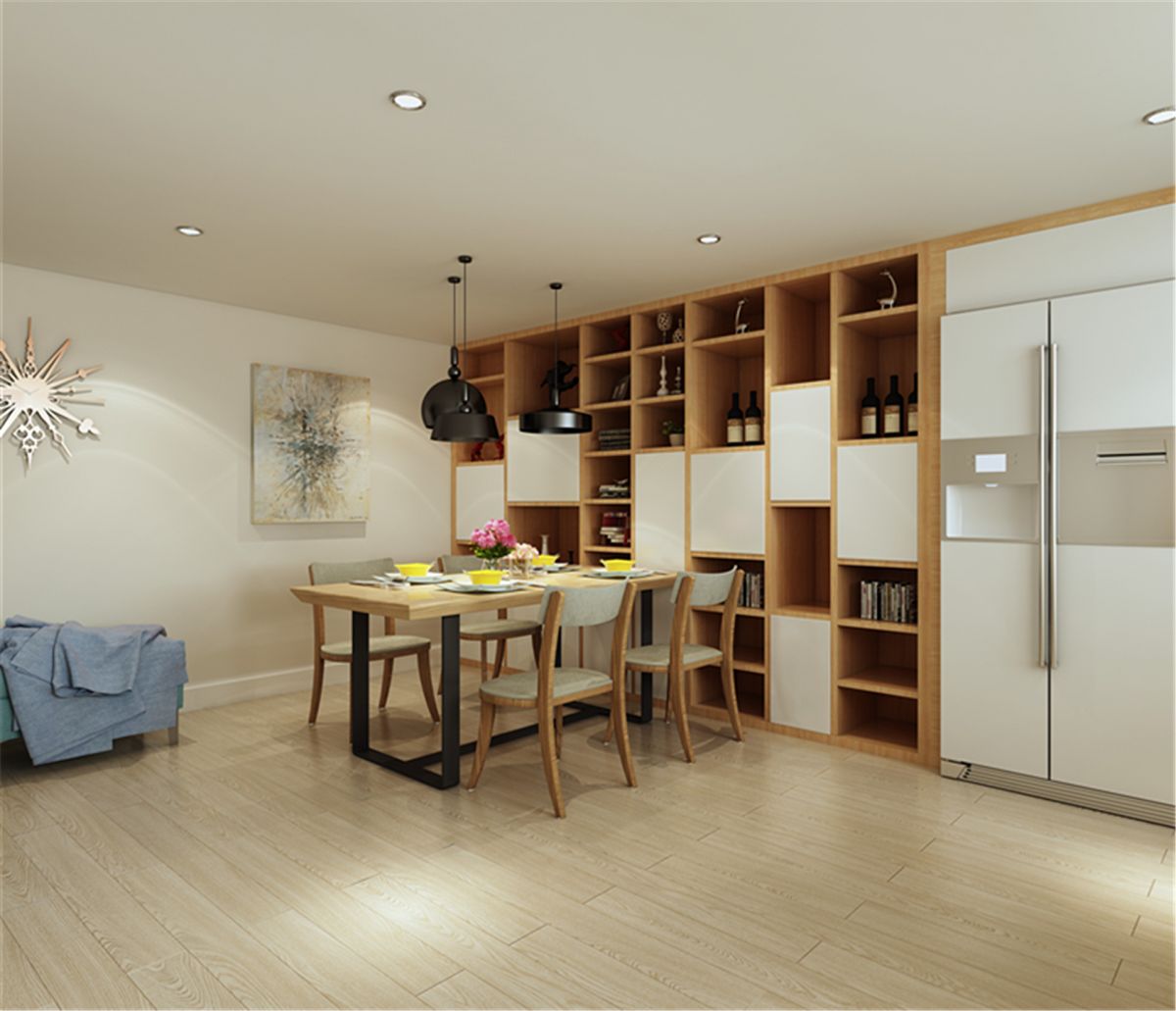 餐廳和客廳位于同一平層,更改房型時,餐廳上方搭建了2層。所以餐廳層高有限,設(shè)計(jì)的亮點(diǎn)是收納柜。
