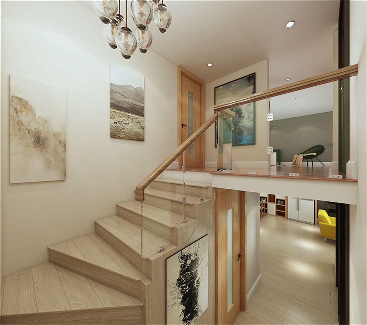 由1樓至2樓的護(hù)欄,用了玻璃和木護(hù)欄,增強(qiáng)了視覺通透性,也解決了采光的問題。