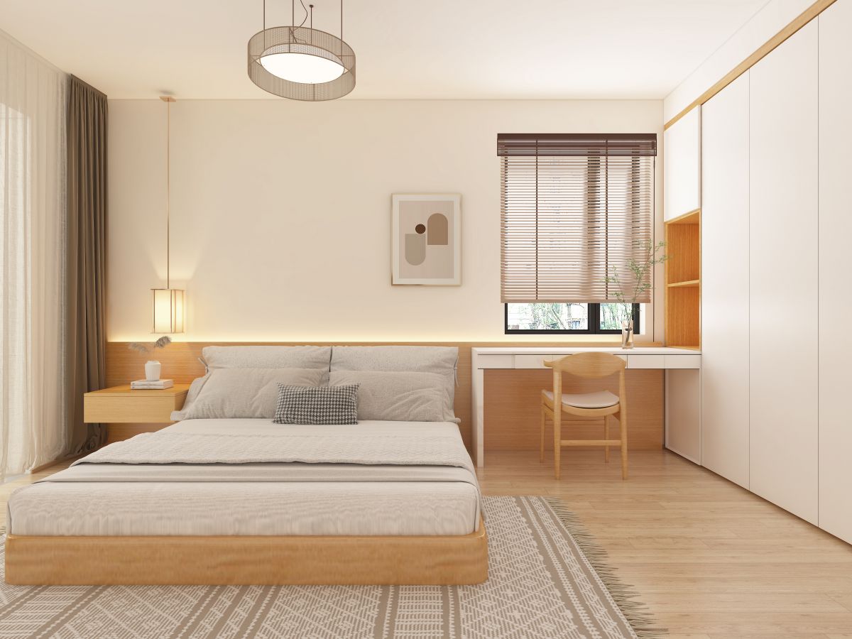 主臥,并沒有經(jīng)過大的格局改動,打通臥室和陽臺之間的窗戶,改成一個(gè)小吧臺,不僅提升空間的明亮度,還多了個(gè)小休憩區(qū)。