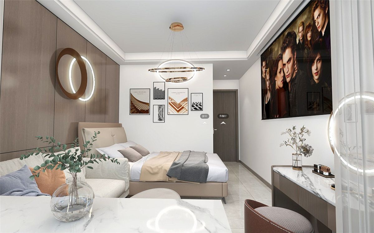 臥室+休閑區,靠墻的一邊是床,靠窗的一邊是沙發、電視。再打通陽臺與臥室之間的隔窗,改為吧臺,以淺色系為主基調,小空間更顯明亮,視覺通透感更強。從餐廚到臥室再到陽臺,地磚通鋪,沒有過門石,一鏡到底,空間敞亮。